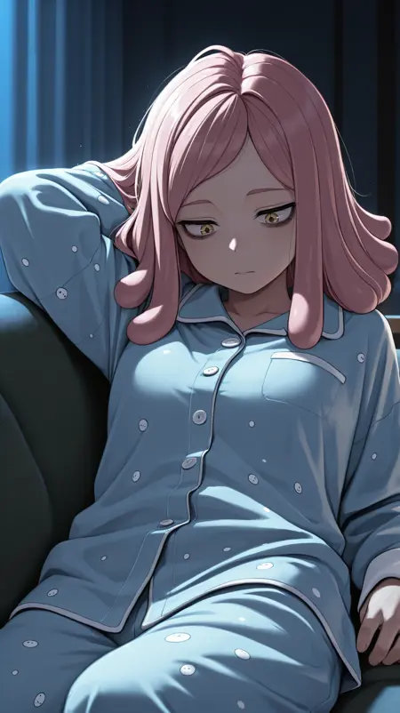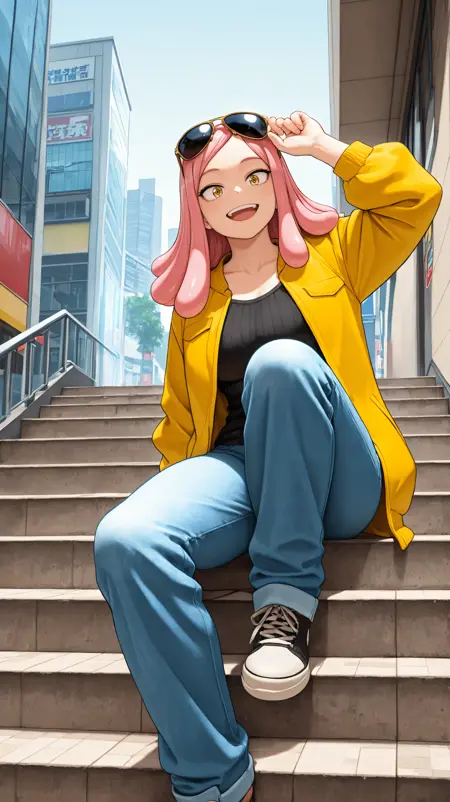 ピンクの髪、中くらいの長さの髪、(丸い髪:1.5)、黄色い目、記号形の虹彩、黒いタンクトップ、リブ柄のタンクトップ、頭にゴーグル、ノースリーブ、黒い手袋、腰周りに黒い服、黒いズボン、