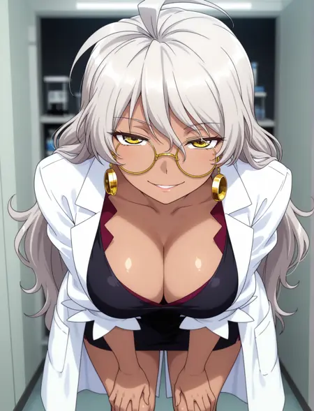uzal delilah, dark skin, grey hair, white hair, long hair, antenna hair, yellow eyes, round eyewear, semi-rimless eyewear, under-rim eyewear, gold eyewear, gold earrings,