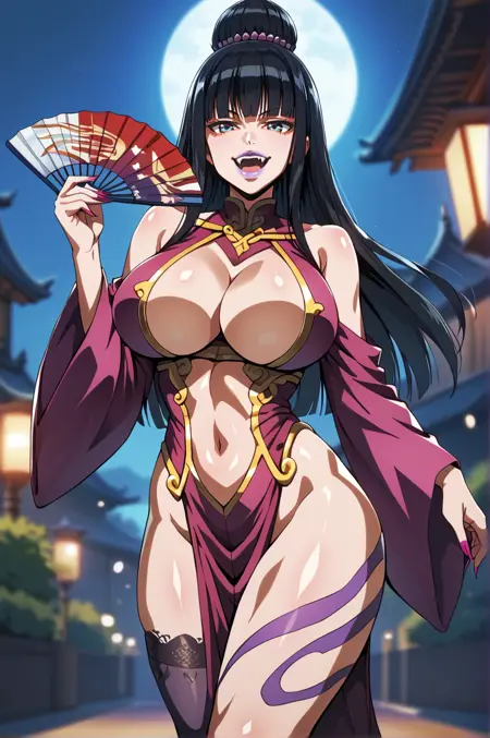 黑发,长发,单发髻,蓝眼睛,巨乳,美甲,妆容,紫色指甲,紫色嘴唇,长指甲,发饰服装