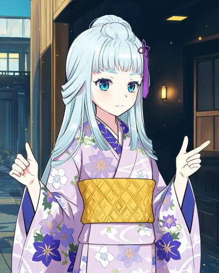 일상 복장: mgrcmizunatsuyu, 단일 보라색 머리핀, 꽃무늬 분홍 키모노, 노란색 오비