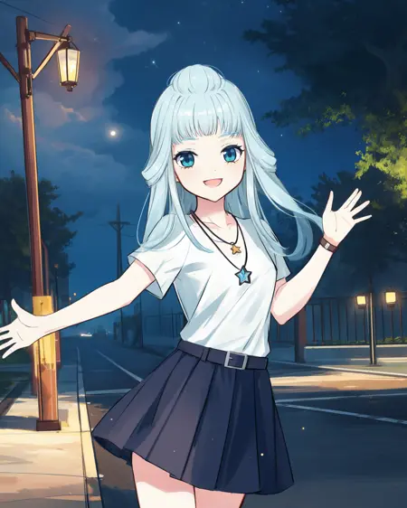 마법사 복장: mgrcmizunatsuyu, 높은 단발머리, 보라색 이중 머리핀, 청록색 셔츠, 검정 손목 보호대, 파란색 손목 보석, 흰 치마, 파란색 일본 갑옷, 파란색 코테, 파란색 긴 부츠