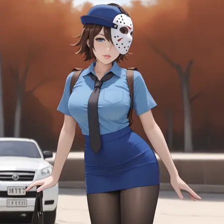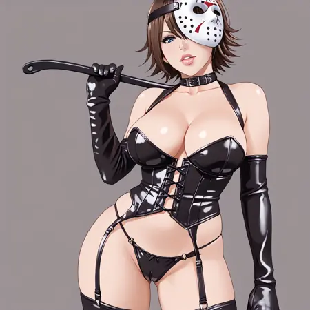 - トリガー:BishoujoJason, 1girl, large breasts, mask, gloves, belt, brown hair, jacket, midriff, blood, cleavage, short hair, chaps, blue eyes, navel, torn pants, lips, denim, crop top