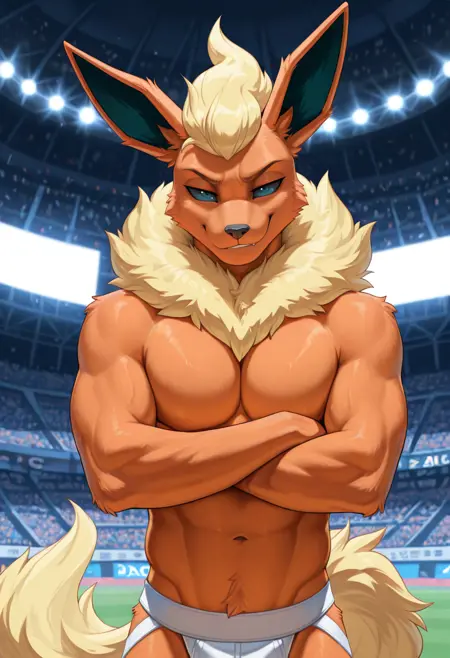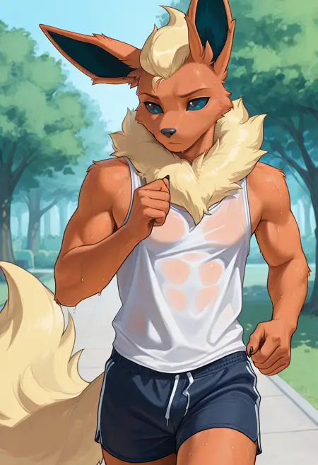 注意: Flareonの男性バージョンを生成する際、トレーニングデータが女性に大きく偏っているため、男性タグを付けていても女性が生成されてしまうことがあります。これを修正するには、「pecs」やその他の男性タグを追加してください。例: muscular male、((male))、(1boy)、slim male など...