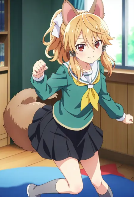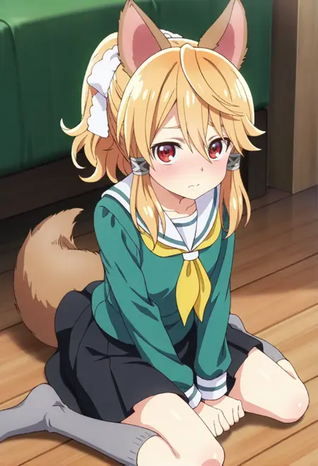 latifa-schooluniform,latifa,red eyes,blonde hair, animal ears,ponytail,fox tail, school uniform, green shirt,yellow neckerchief,black skirt,grey socks
