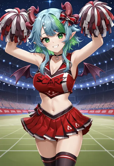 + pom pom (cheerleading), holding pom poms, demon wings,