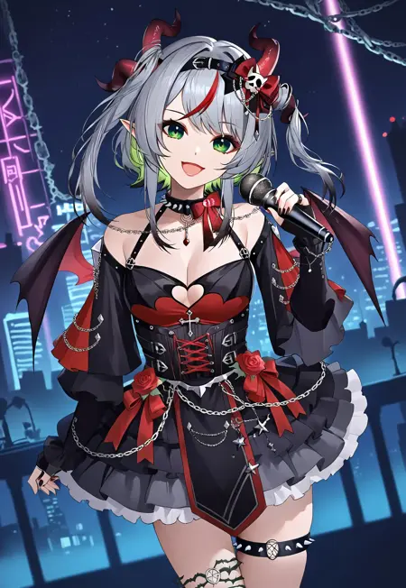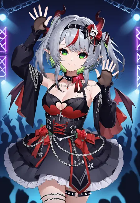 ヴァンパイア・アイドル+ FrootVampIdol, 緑の目、多色の髪、ストライプ入りの髪、悪魔の角、前髪、灰色の髪、赤い髪、髪飾り、緑の髪、色のついた内毛、ツインテール、とがった耳、黒いヘアバンド、長い髪、