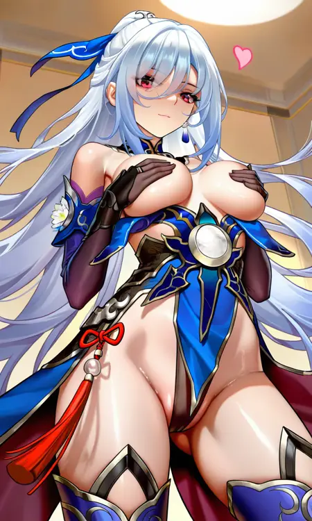 TAG:tj_jingliu,白髪,ロングヘア,ポニーテール,髪リボン,赤い目,ピアス