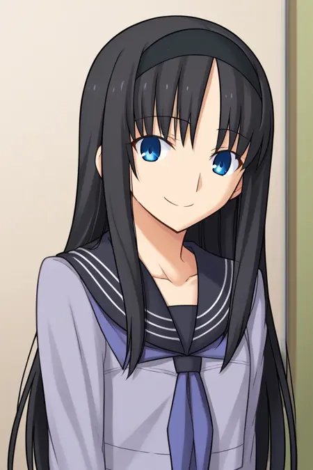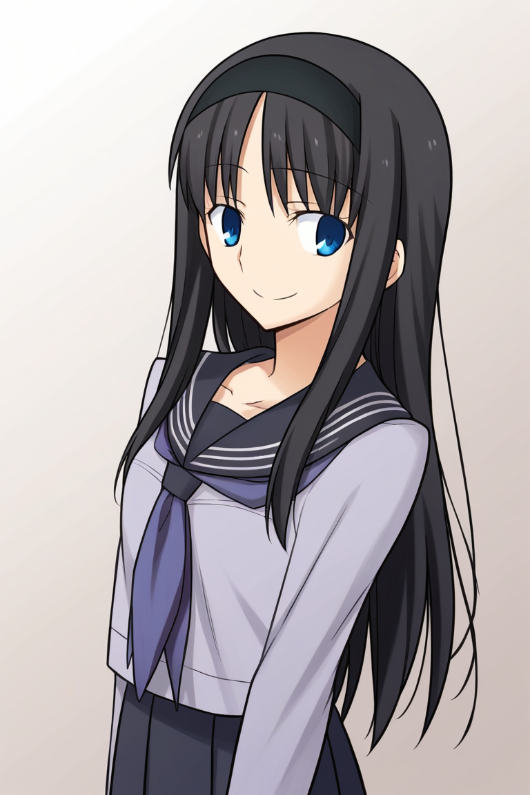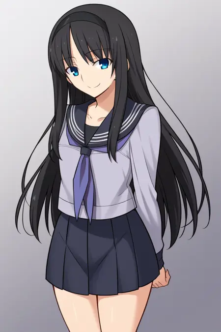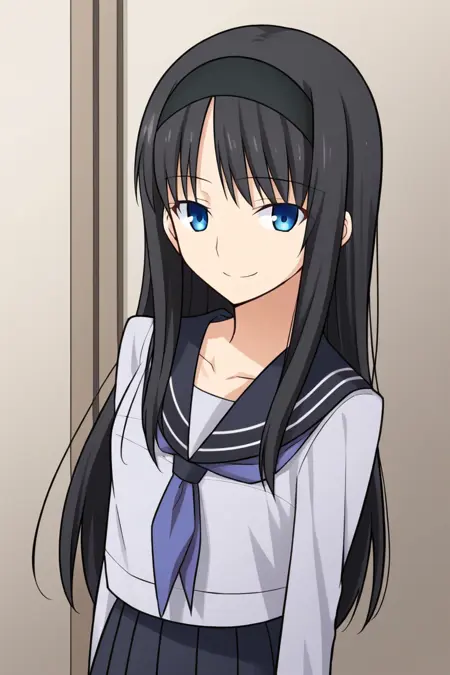 프롬프트: Akiha_Tohno, 1girl, solo, 긴 머리, 검은 머리, 파란 눈, 헤어밴드, 검은 헤어밴드, 학교 uniform, 긴 소매, serafuku, 해군 칼라, 넥커치프, 치마