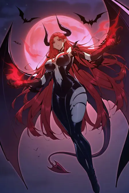 Chr_Elizabeth, red eyes, red hair, horns, demon wings, bodysuit, shoulder armor, gauntlets