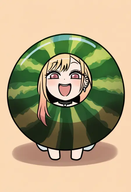 1other, Watamelon, no humans, cosplay, chibi, watermelon, all fours, smile, smug, half-closed eyes