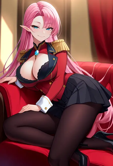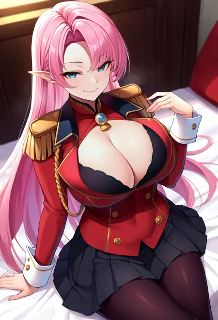 기본 피부: MLDYork, 검정 브라, 가슴 노출 컷아웃, 어깨장식, 큰 가슴, 긴 머리, 긴 소매, 팬티후스, 분홍 머리, 주름치마, 뾰족한 귀, 유니폼 재킷, 빨간 재킷, 하이힐,