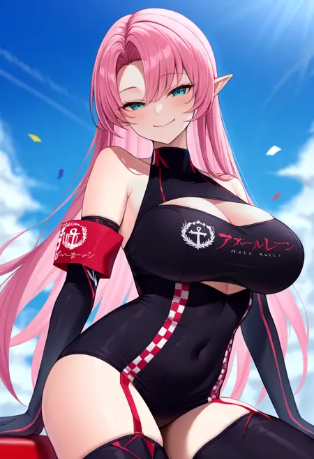 영광스러운 공식의 명예 (레이스 퀸): MLDYRQ**, 어깨 노출, 검은 레오파드, 체크 무늬 테두리, 가슴 노출 컷아웃, 칼라 있는 레오파드, 팔꿈치 장갑, 큰 가슴, 긴 머리, 분홍 머리, 레이스 퀸, 빨간 팔찌, 뾰족한 귀,_