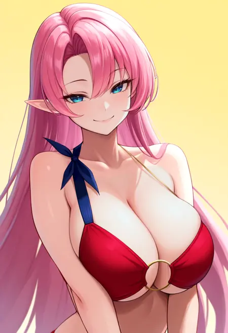 O-링 비키니 - mldyobk, 어깨 노출, 파란 눈, 가슴 노출, 클라비클, 큰 가슴, O-링 비키니, 분홍 머리, 뾰족한 귀, 빨간 비키니, 한쪽 스트랩 수영복, 매우 긴 머리,