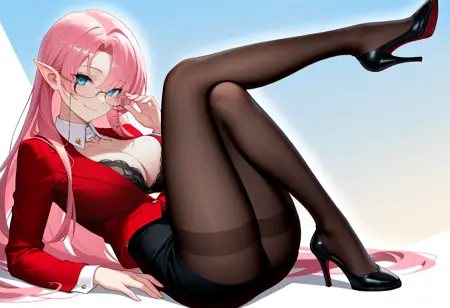 The Chic Counselor (OL) - mldycchc, black bra, blue eyes, cleavage, eyewear strap, glasses, high heels, long hair, long sleeves, pencil skirt, pink hair, pointy ears, red jacket, semi-rimless eyewear, smile, thighband pantyhose, very long hair, white collar, black skirt,