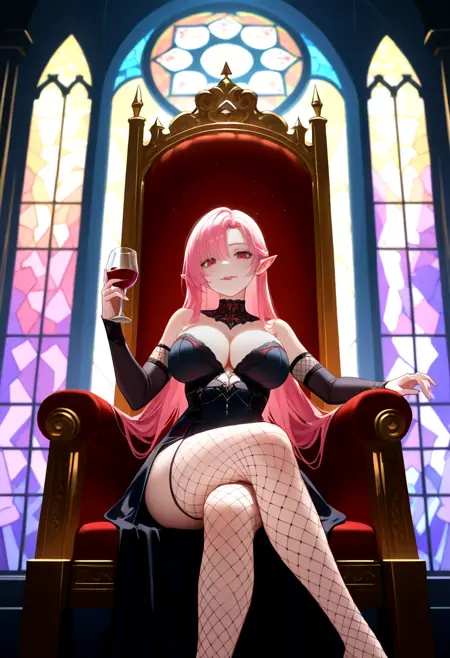 Eternal Night's Carola (Black Vampire dress): MLDYCorolla, bare shoulders, black dress, cleavage, detached sleeves, fishnets, long hair, pink hair, pointy ears, red eyes, strapless dress
