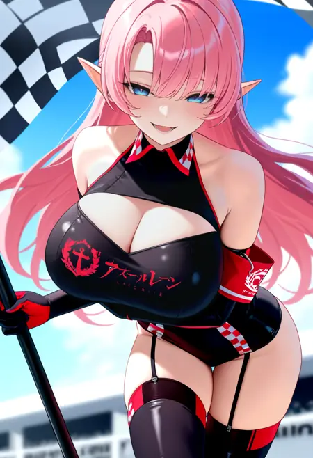 Prestige of the Glorious Formula (Race Queen): MLDYRQ, bare shoulders, black leotard, checkered trim, cleavage cutout, collared leotard, elbow gloves, large breasts, long hair, pink hair, race queen, red armband, pointy ears,