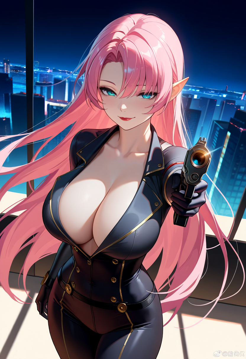 Misc: mldyrnd, very long hair, pink hair, pointy ears, blue eyes
