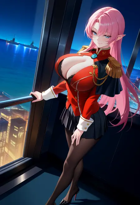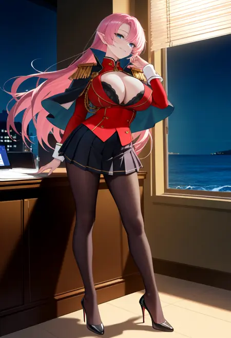 Base Skin: MLDYork, black bra, cleavage cutout, epaulettes, large breasts, long hair, long sleeves, pantyhose, pink hair, pleated skirt, pointy ears, uniform jacket, red jacket, high heels,