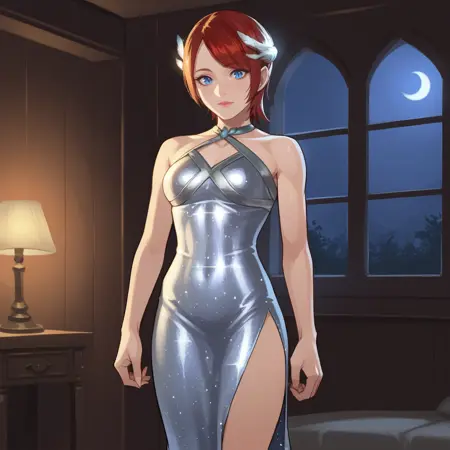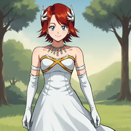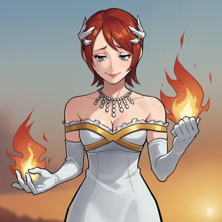 Optional: short hair, red hair, blue eyes, white elbow gloves, hair ornament, white dress, bare shoulders, necklace, high heels