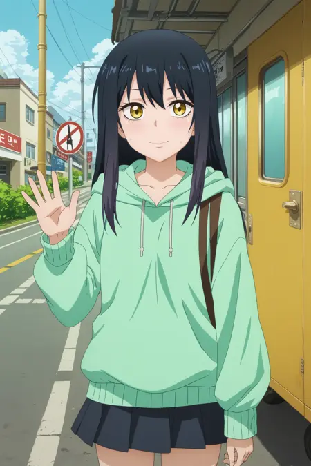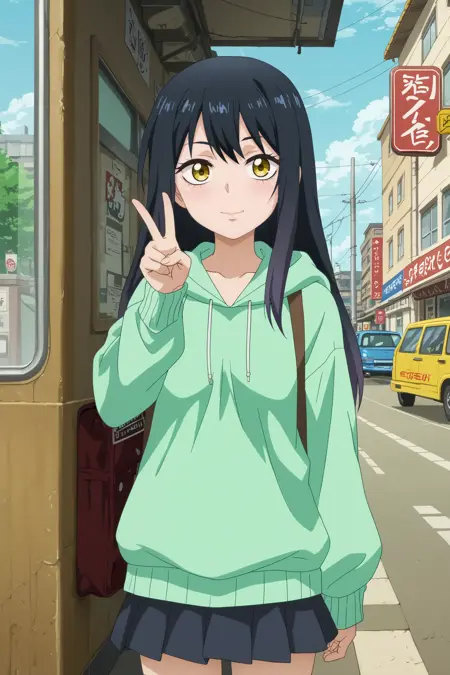 绿色连帽衫:mieruko,1girl,solo,long hair,hooded sweater,green hoodie,black skirt,mini skirt