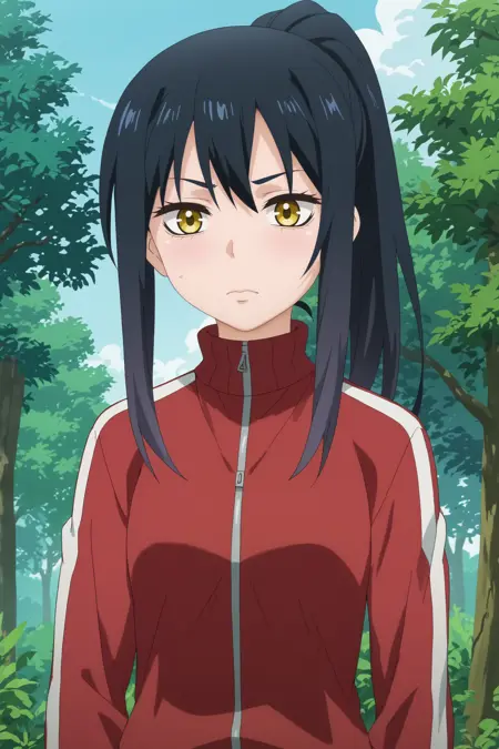 运动服:mieruko,1girl,solo,long hair,ponytail,red track jacket,red short,red turtleneck