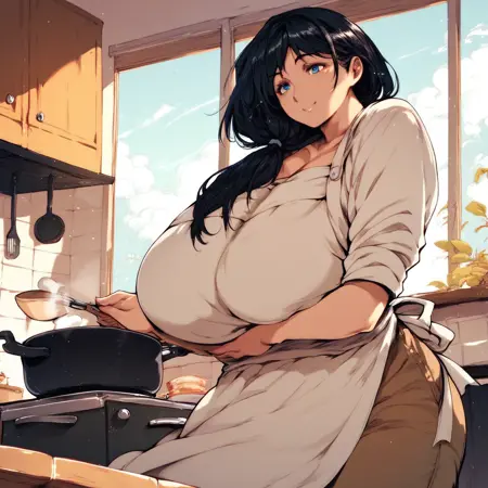 ReikoOBI, 1girl, black hair, long hair, hair over shoulder, apron, huge breasts,