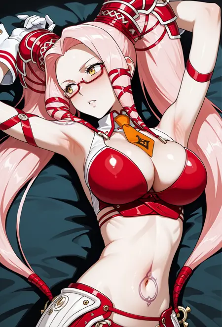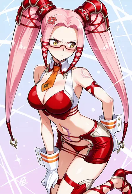 黄色眼睛,粉色头发,长发,鬓发,双马尾,红色镜框眼镜,下框眼镜,半框眼镜,眼镜,纹身,腹部纹身,