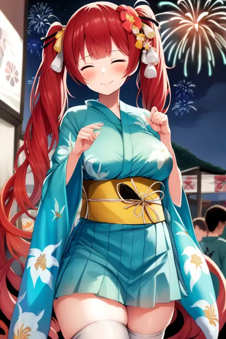 Honolulu, HonoluluKimono, 매우 긴 머리, 트윈테일, 파란 기모노, 플로럴 프린트, 띠, 머리 꽃, 흰 허벅지 양말