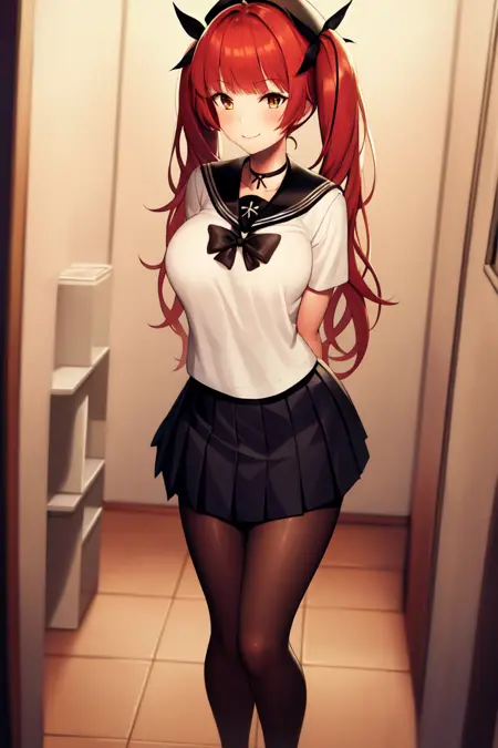 Honolulu, HonoluluSchool, 긴 머리, 트윈테일, 서라푸크, 짧은 소매, 머리 리본, 검은 리본, 검은 스타킹, 검은 치마, 베레모, 초커