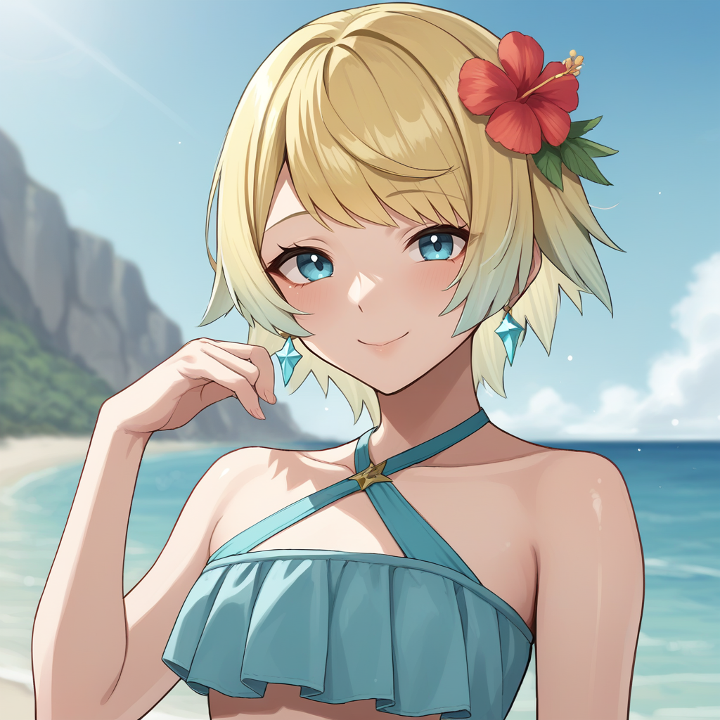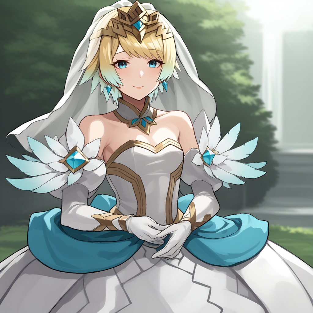 オプション:グラデーションヘア、多色ヘア、ショートヘア、金髪、前髪、青い目、羽のフリル、肩甲骨アーマー、長袖、ブーツ、マント、シンクホーズ、ショートドレス、絶対領域、ティアラ、ジュエリー