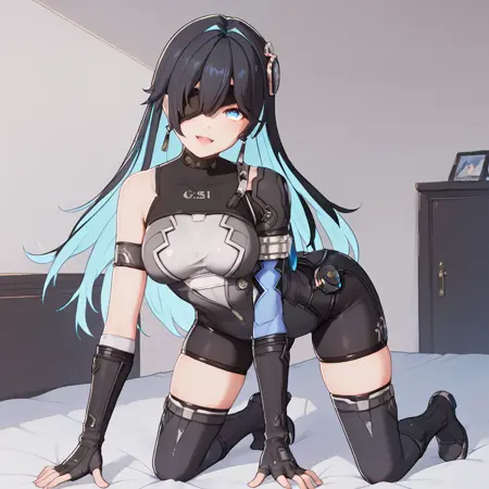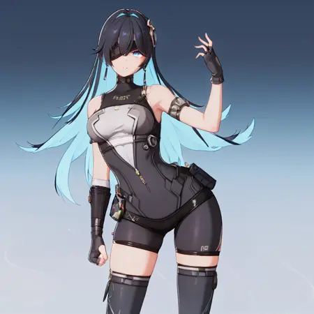 바디수트, 파란 소매, 비대칭 의상, 비대칭 하의, 헤어 장신구, 허벅지까지 긴 양말, 안대, 장갑, 손가락 없음 장갑, 검은 신발, 부츠,