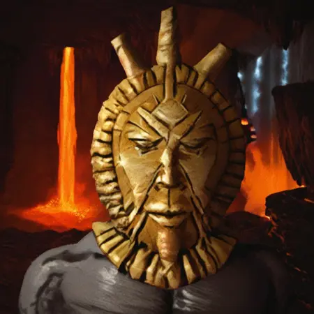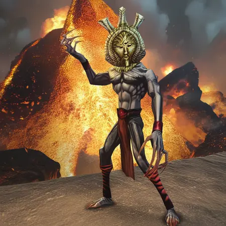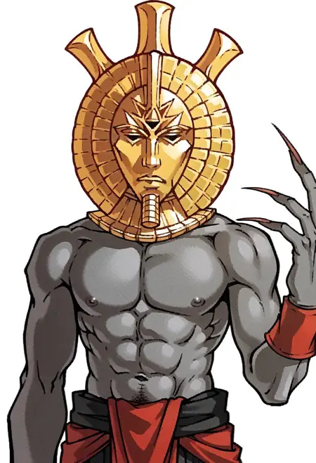 태그: DagothUr_TES3, 회색 피부, 색상 피부, 금색 마스크, 마스크, 제삼의 눈, 고르겟, 금색 고르겟, 상체 벗은 남성, 근육질, 복근, 벨트, 문어치, 팔보호대, 긴 손가락, 긴 손톱, 날카로운 손톱, 발목 감싸기, 맨발,