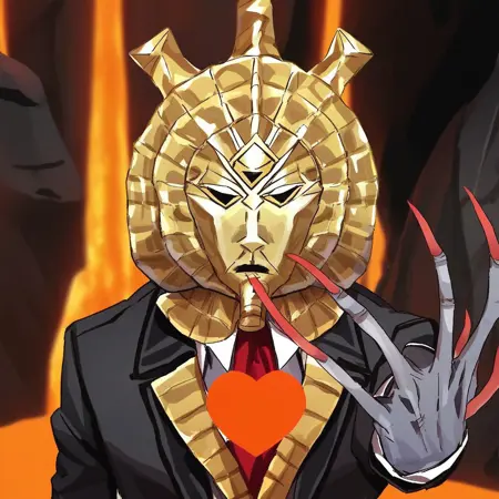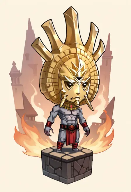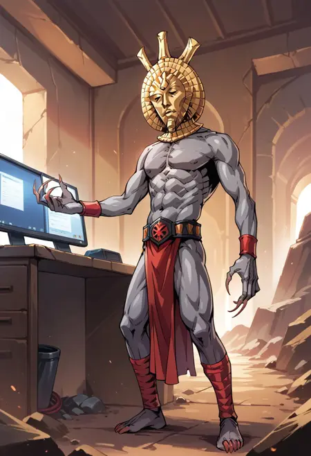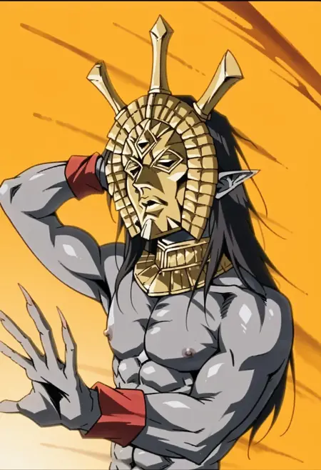 タグ: DagothUr_TES3, 灰色の肌, 色付きの肌, 金色のマスク, マスク, 第三の目, ゴルゲット, 金色のゴルゲット, 上半身裸の男性, 筋肉質, 腹筋, ベルト, ロインクロス, ブレイサー, 長い指, 長い爪, 尖った爪, 足首の巻き布, 裸足,