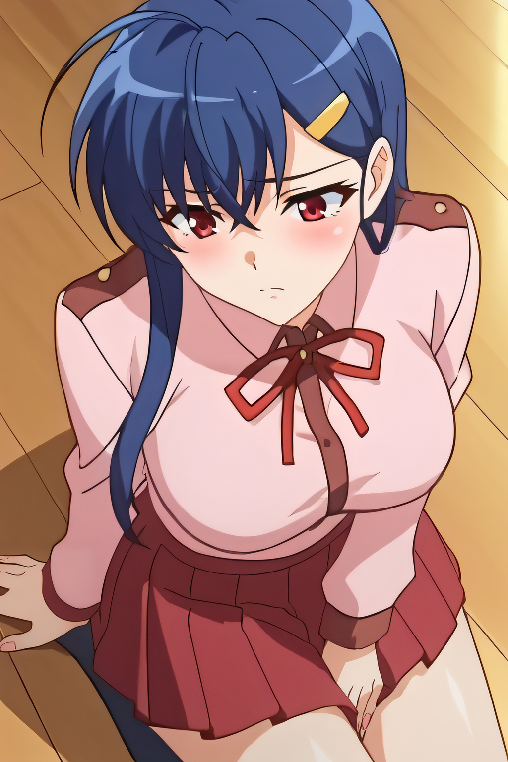 reiko, blue hair, closed eyes, yellow hairclip, large breasts