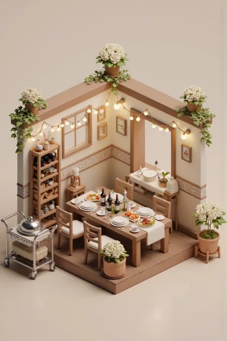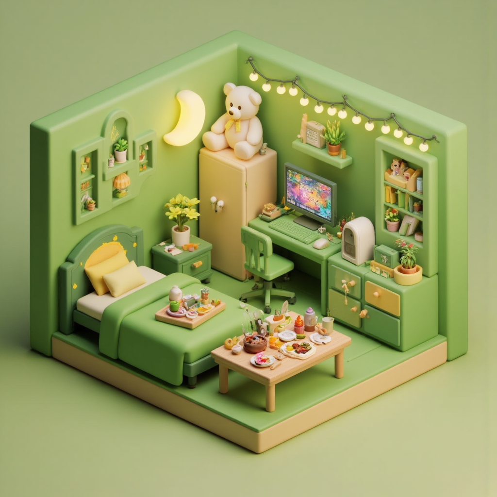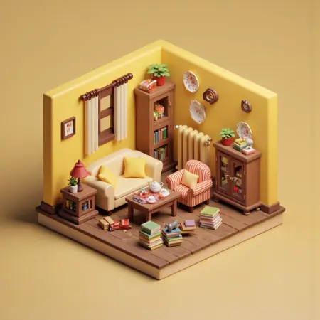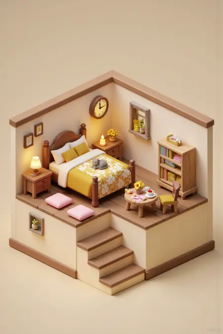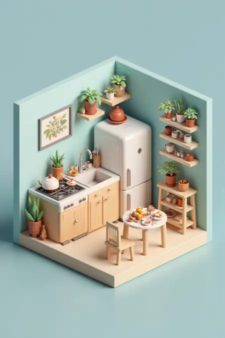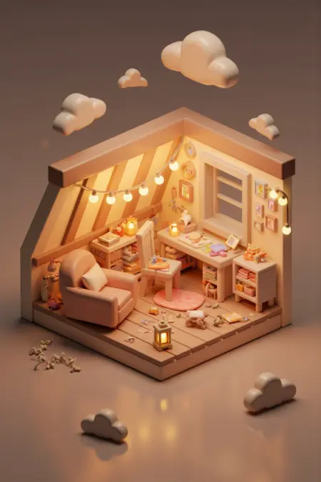 이 스타일은 쾌적하고 기발한 분위기의 미니어처 등각 내부 장면을 특징으로 합니다. 각 장면은 식물, 주방용품, 아늑한 액세서리와 같은 세심하게 배치된 가구와 장식 요소로 가득 찬 상세한 소규모 방을 묘사합니다. 부드러운 색조와 따뜻한 조명은 초대하는 분위기를 조성하며, 등각 시점은 깊이와 공간적 구조를 강조합니다. 세부 사항에 대한 신경과 장난스러운 디자인은 매력적인 느낌을 불러일으키며, 작은 방 하나하나가 개성과 편안함으로 가득 찬 미니어처 세계처럼 느껴집니다.
