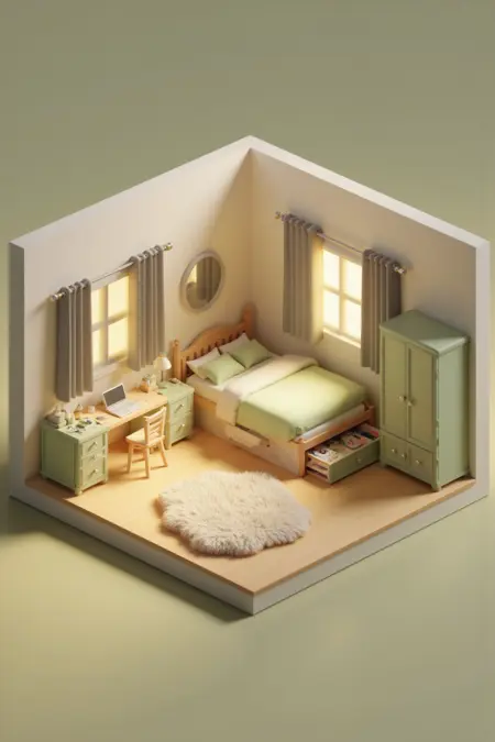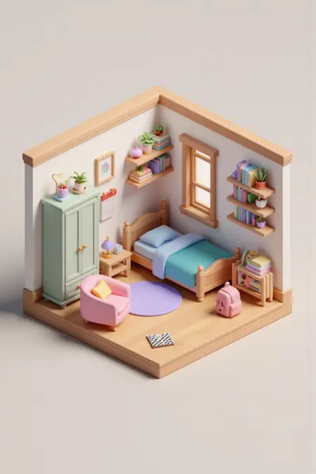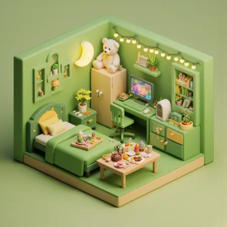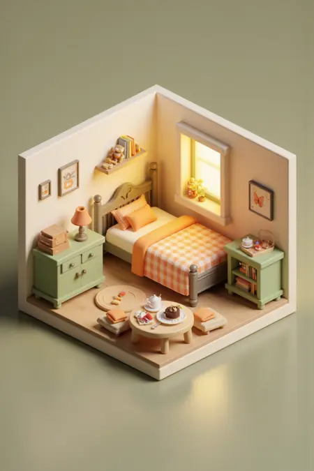 このスタイルは、小さくて居心地のよさとユーモラスな美意識を持つ縮尺の等角図室内シーンを特徴としています。各シーンには、植物、台所用品、家庭的な小物など、丁寧に配置された家具や装飾品が詳細に描かれた小さな部屋が表現されています。やさしい色調と温かい照明が招き入れるような雰囲気を生み出し、等角図の視点が奥行きと空間の構成を強調します。細部へのこだわりと遊び心あるデザインが魅力を呼び起こし、それぞれの小さな部屋が個性と快適さに満ちたミニチュアの世界のように感じられます。