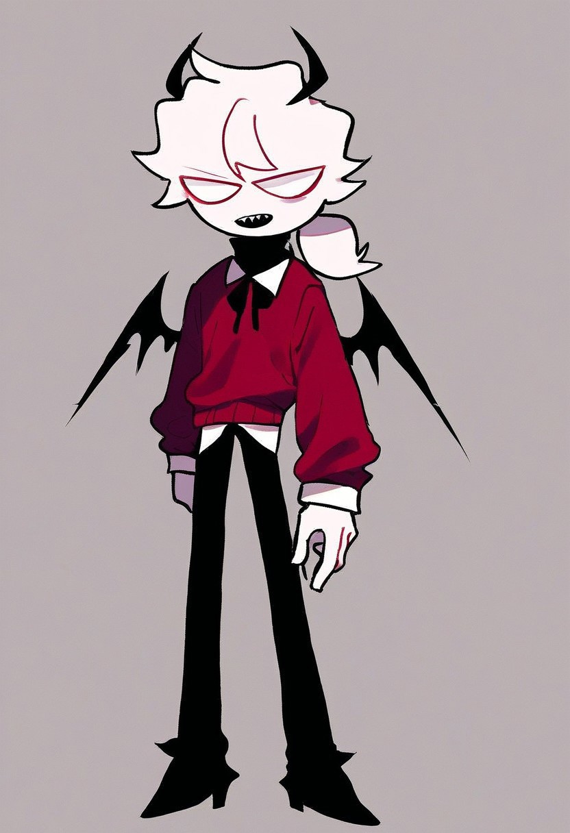 タグ: selever、悪魔、白い肌、乱れた白い髪、一つのポニーテール、白い目、鋭い歯、悪魔の角、悪魔の翼、男性、ローズカラーのセーター、黒いズボン、黒い靴、男性、棒人間、棒状の絵