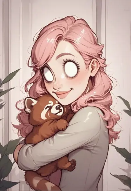 - 推薦文:Don't Starveスタイル。長く波打つピンク色の髪を持つ女性の絵画。彼女は腕に茶色のパンダを抱いている。パンダは白い顔に黒い目と黒い鼻を持っている。彼女は微笑んでいる。髪はポニーテールにまとめられている。薄いグレーのシャツを着ている。パンダの左側には緑の植物がある。