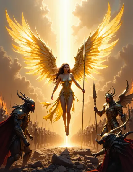 多样的角色设计:创造出生动的天界生物形象,包括身披闪耀长袍的光辉天使,以及面容锐利、披着暗影斗篷的强大恶魔。