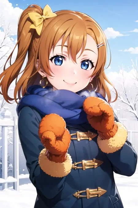 必要なタグ:1girl, solo, kousaka honoka, yellow hair bow, one side up, orange hair, blue eyes, medium hair
