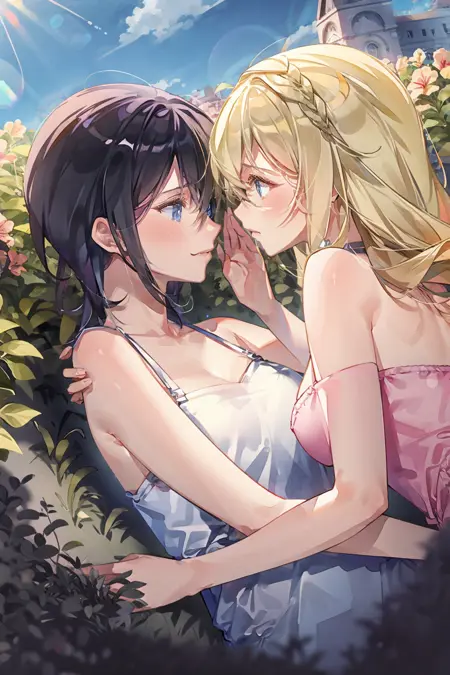 可以生成两个人的画面,只需要去掉solo,把1girl改成2girl就行,其他触发词也要全部加上,但是瞳色可能会搞混。