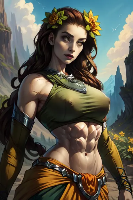 flower hair ornament ,midriff, bare shoulders, detached sleeves ,long skirt,