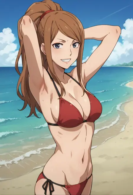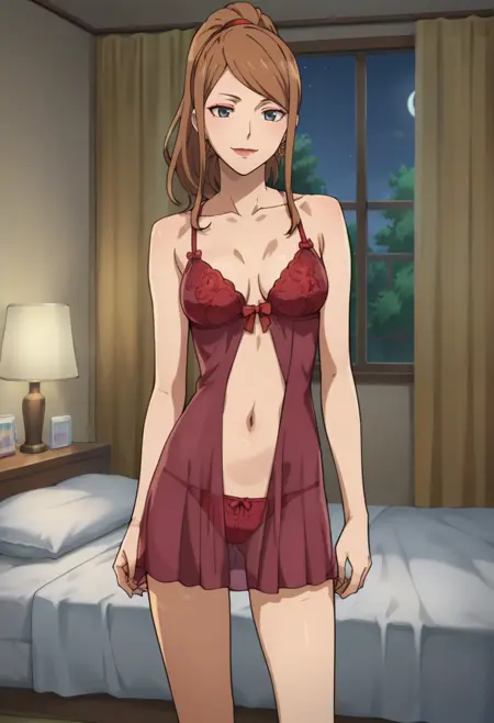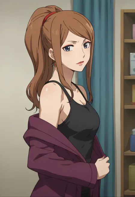 rikako,1girl,solo,grey eyes,brown hair,long hair,high ponytail,earrings,makeup,lipstick,