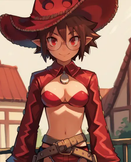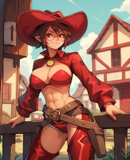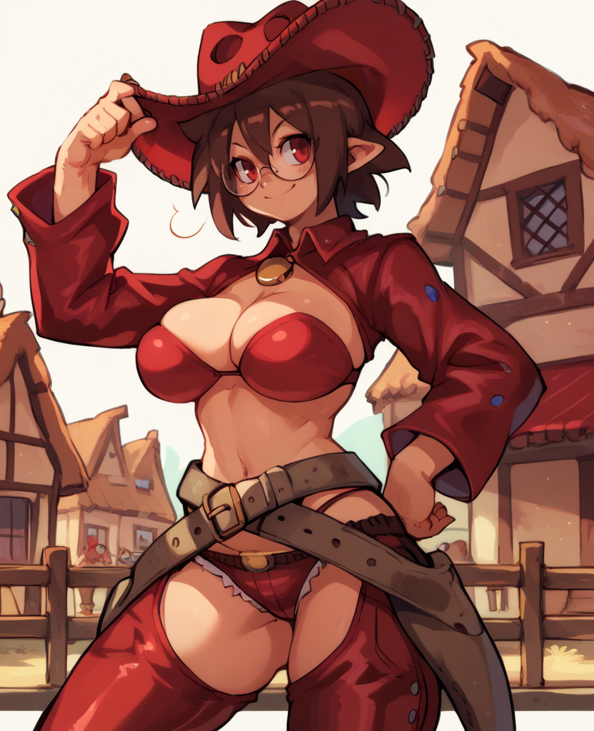전체 복장은 빨간색이며 갈색 벨트 및 스트랩이 있음 - 이 요소들을 NEG에 추가하여 줄일 수 있음