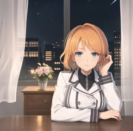 <lora:Kaela2-08:0.8> Kaela MacMillan, 短い髪、オレンジ色の髪、青い目、中程度の胸、イヤリング、