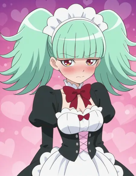 score_9, score_8_up, score_7_up, 애니메이션 스크린캡, 솔로, 1소녀, 연한 녹색 헤어, 트윈테일, 노란 눈, 둔한 앞머리, 긴 머리, 메이드, 메이드 헤드기어, 앞치마 lora:bibury:0.8