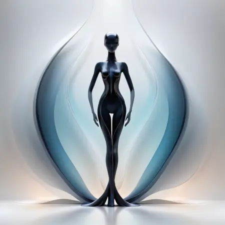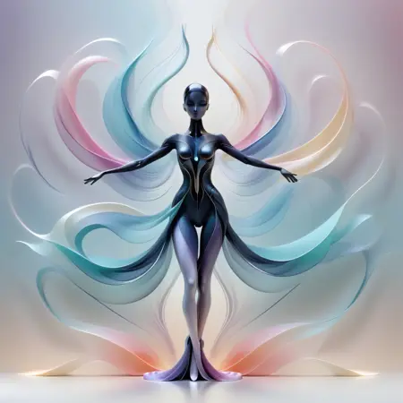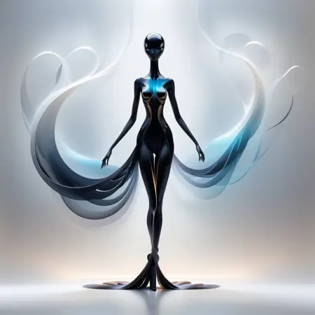 - 优雅的人形形象,修长肢体,对称流动线条,渐变光晕,未来主义