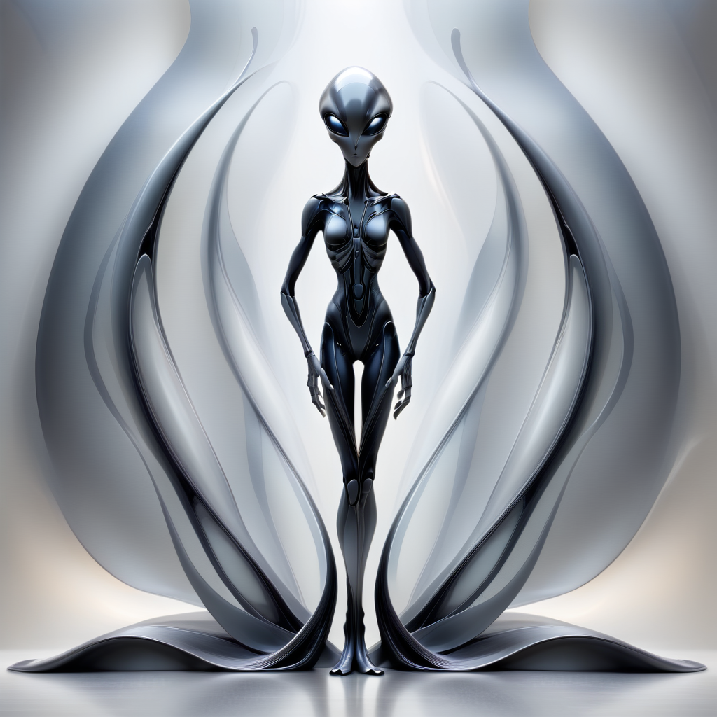 - 优雅的外星人形象,身形纤细,线条流畅且呈曲线状,黑色轮廓,渐变光亮背景