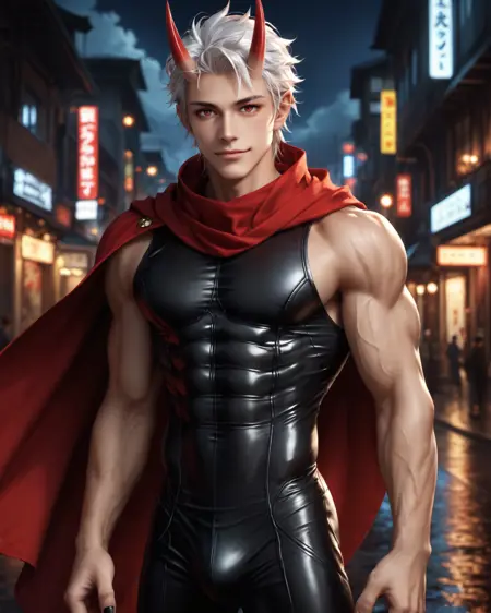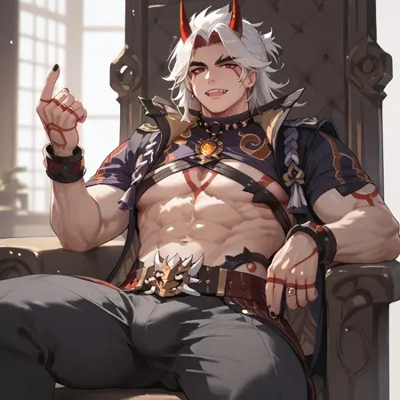 trigger words: 1boy, solo, Arataki Itto, Oni Horns, Red Horns, abs, red eyes, white hair, black nails, muscular body, red tatto