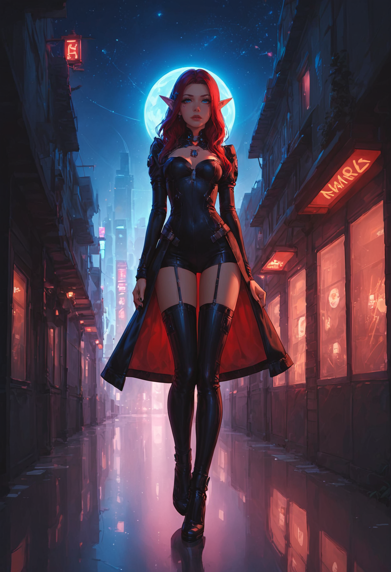 <'fantasy'*1.1+'cyberpunk'*1.5+'gothic'*0.6> 스타일, <'dark'*1.6+'neon'*0.9> 분위기, <'futuristic'*1.5+'magic'*1.1> 디테일, <'medieval'*0.7+'techwear'*1.1> 의상